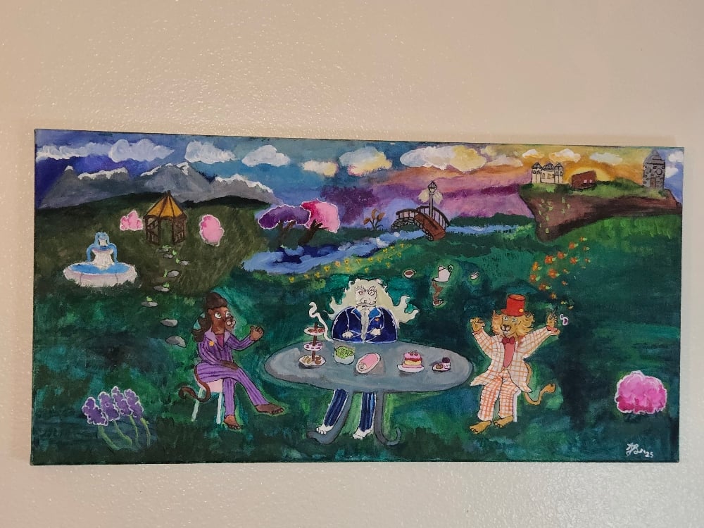 An acrylic 15x30" painting. This gentlelion's club having their weekly tea.